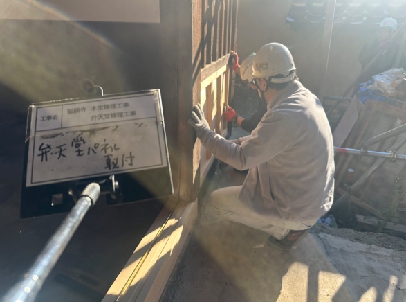 弁天堂の扉と腰壁パネルの修復